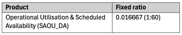 For NGDSO competitions that include availability payments, you will not need to enter availability prices when you bid. NGDSO will determine your availability pricing by applying a fixed ratio (utilisation price x fixed ratio) to your utilisation price. The different fixed ratios by product type are listed below: